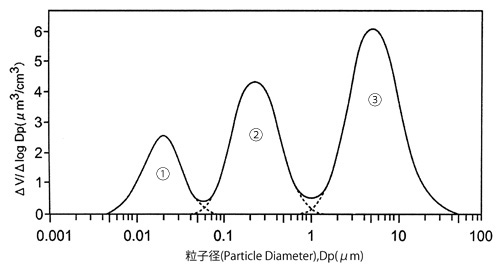 粒径によってエアロゾルを分類すると、下の図のように①、②、③の3つの山に分かれた分布を示します。