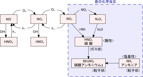 夜、日が沈むと日中高濃度になった NO3 やこれと NO2 が反応して生成する N2O5 が大気中に蓄積される。そしてこれらと水が反応してできる硝酸 ( HNO3 ) がもととなってエアロゾルが発生する。これは「夜の化学反応 ( Nighttime chemistry ) 」と言われている。